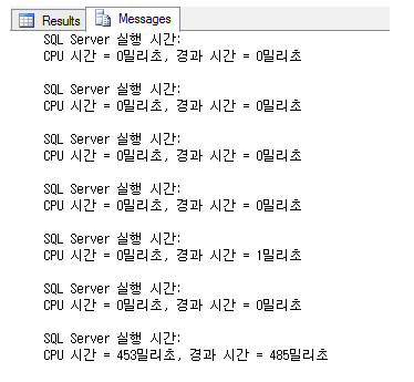 위와같이 쿼리를 실행하면 EM결과창의 Message 탭에 아래와 같이 수행되는 모든 쿼리의 수행 시간이 밀리초 단위로 출력됩니다.