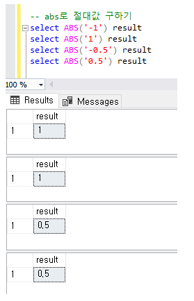 -- abs로 절대값 구하기 select ABS(-1) result select ABS(1) result select ABS(-0.5) result select ABS(0.5) result