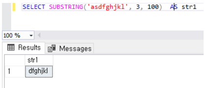 SELECT SUBSTRING('asdfghjkl', 3, 100) AS str1