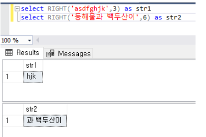 select RIGHT('동해물과 백두산이',6) as str2
