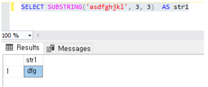 SELECT SUBSTRING('asdfghjkl', 3, 3) AS str1