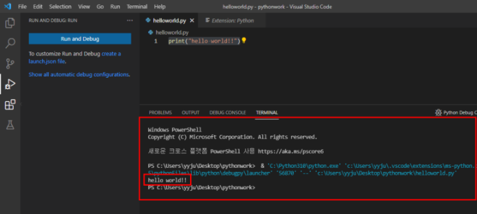 이제 터미널창에 프로그램이 실행되고 hello world!!라고 찍힌 것을 확인할 수 있습니다!!
