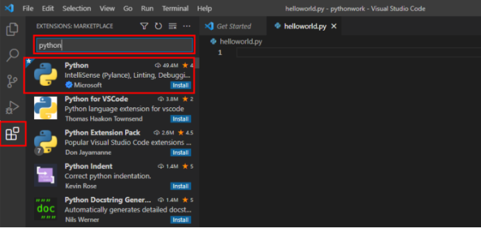 코딩의 편의를 위해 좌측에 익스텐셔 아이콘을 클릭 > "python" 입력 후 맨 위에 검색되어진 Microsoft사의 Python의 Install을 클릭 후 설치가 완료될때까지 조금 기다리면 완료됩니다.