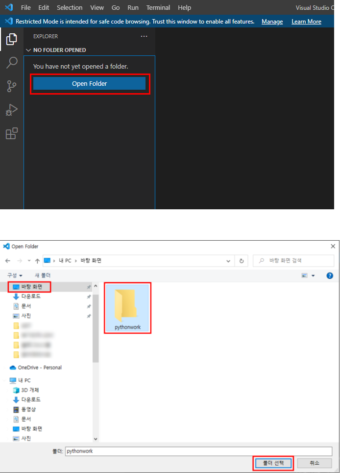visual studio code를 열고 Open folder를 클릭하여 바탕화면에 만들어 둔 pythonwork 폴더를 선택해 줍니다.