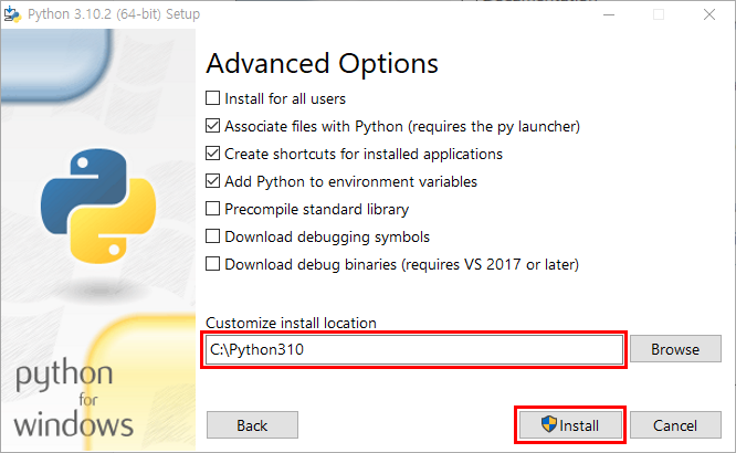 설치경로에는 위와 같이 간단하게 원하는 드라이브에 Python310으로 입력하고 Install 버튼을 눌러주세요.