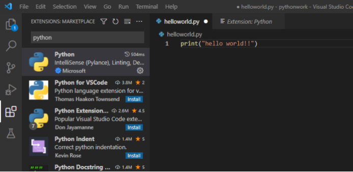 helloworld.py 탭으로 돌아가서 print("hello world!!") 라고 입력하 후 저장을 합니다.(저장 : ctrl + s)