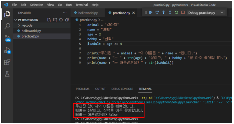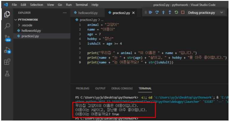 print("우리집 " + animal + "의 이름은 " + name + "입니다.")