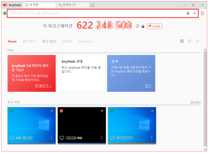 아이디 표시 윗쪽에는 원격 데스크의 주소를 입력하십시오라고 쓰여 있습니다. 여기에 원격 pc에 실행 중인 애니데스크의 아이디를 입력하면 원격 pc에 접속 및 제어가 가능합니다.