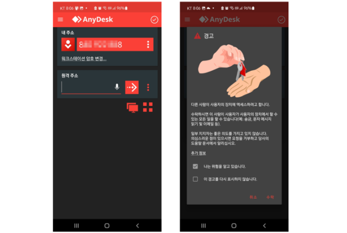 pc에서 스마트폰을 제어하기 위해 스마트폰에 애니데스크를 설치하고 실행하면 내 주소(아이디)가 상단에 표시되는데 이 아이디를 pc의 애니데스크에 입력하여 접속을 시도하면 우측 그림과 같이 스마트폰에 다른 사람이 사용자의 장치에 액세스 한다는 경고가 뜹니다. 여기서 수락을 눌러줍니다.