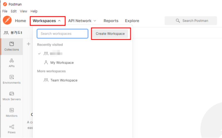 포스트맨을 실행하여 Workspaces를 클릭 후 새로운 workspaces를 생성하기 위하여 Create Workspaces를 클릭합니다.