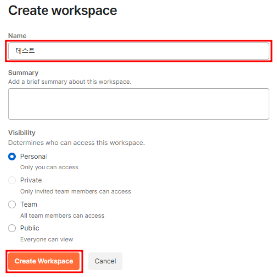 포스트맨을 실행하여 Workspaces를 클릭 후 새로운 workspaces를 생성하기 위하여 Create Workspaces를 클릭합니다.