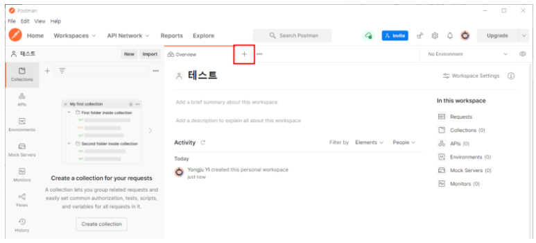 테스트라는 이름의 Workspaces가 만들어지면 + 탭을 눌러서 새로운 API를 테스트할 준비를 합니다.