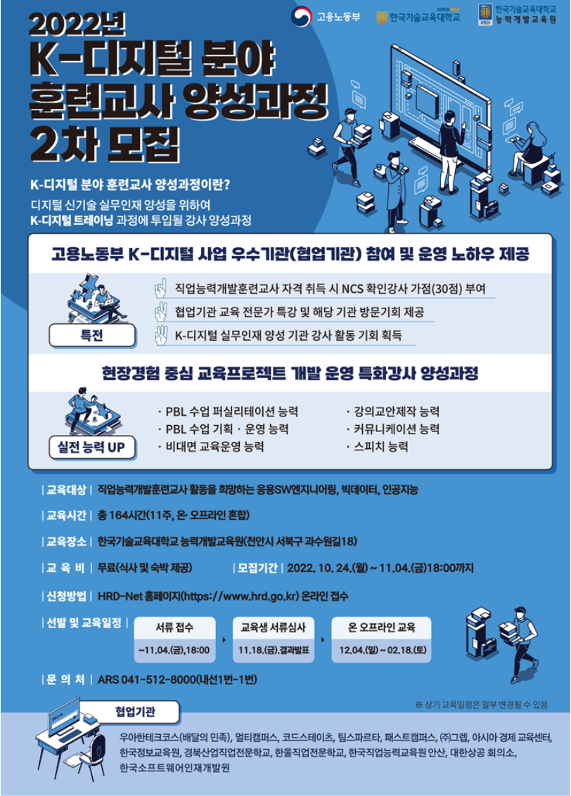 오늘은 한국기술교육대학교 능력개발교육원에서 실시하는 2022년 K-디지털분야 직업능력개발 훈련교사를 양성한다는 소식이 있어 전해드립니다. 이번이 2차 모집입니다.