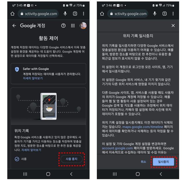 3. 활동 제어 화면에서 위치기록의 '사용중지' 버튼을 눌러줍니다. 위치 기록 일시중지 안내문 아래에 '일시중지' 버튼을 눌러 주세요.
