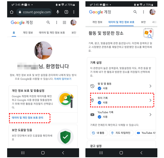 2. 구글 계정 화면이 나오면 '데이터 및 개인 정보 보호 관리' 항목을 찾아 들어간 후 '위치 기록'으로 들어갑니다.