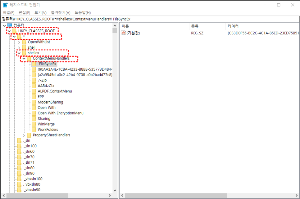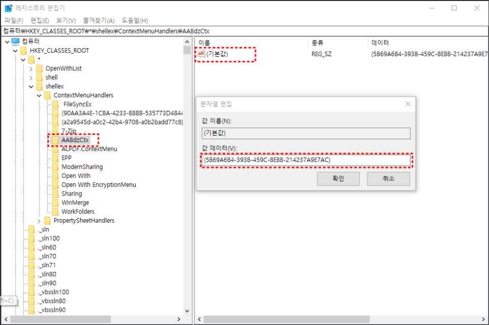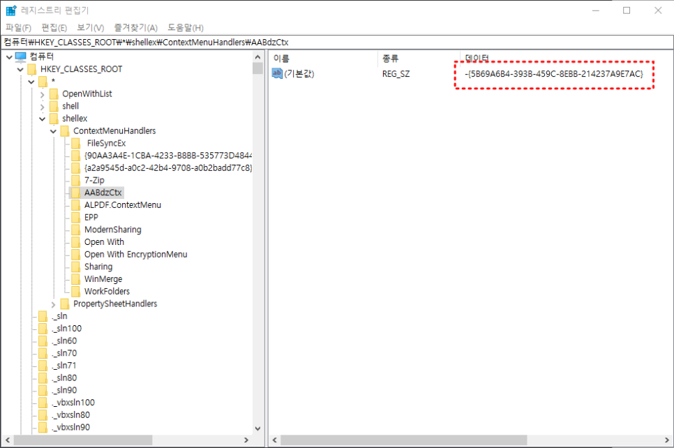 HKEY_CLASSES_ROOT > * > shellex > ContextMenuHandlers 순서대로 펼쳐주면 ContextMenuHandlers 안에 여려개의 폴더가 또 있는데 그게 바로 컨텍스트 메뉴의 키들입니다. 각각의 키 기본값을 수정해야 합니다.