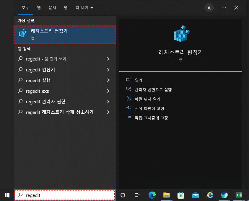 윈도우 명령어 입력창에 'regedit'를 입력하고 엔터키를 눌러서 레지스트리 편집기를 실행해 줍니다.