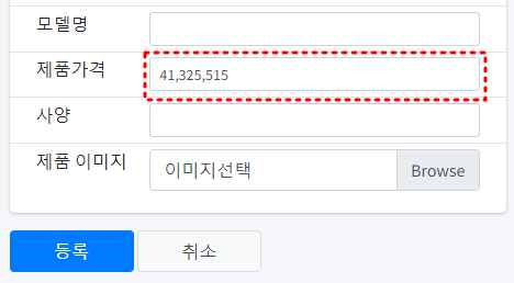 위 그림은 어떤 제품의 정보를 입력하는 입력폼입니다. 제품가격에 숫자를 입력해야 하는데 단위가 큰 경우 입력할 때에도 백만단위인지 천만단위인지 한 눈에 알아보기 어렵습니다.