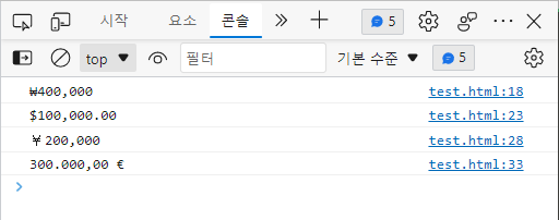이 때 활용할 수 있는 예제인데, Intl.NumberFormat의 기본 파라미터에 화폐단위 파라미터를 추가해 주면 된다.