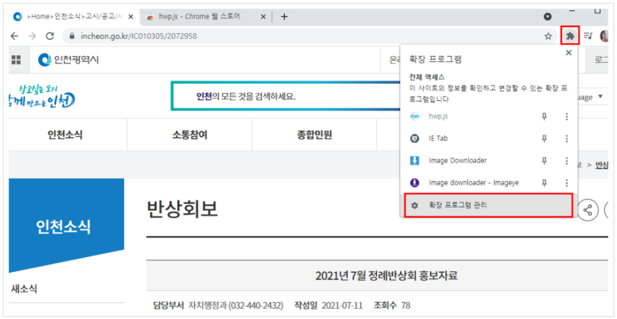 우측 상단에 확장프로그램 아이콘을 클릭 >