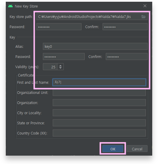 국가, 지역, 개발기관 등의 정보는 생략해도 APK 생성에 문제 없습니다.