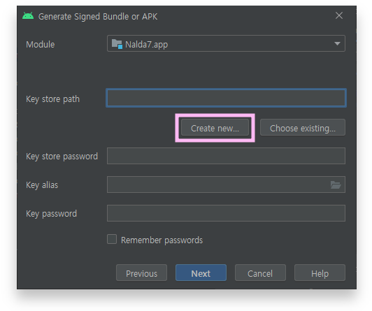 키스토어 경로를 새로 등록하기 위해 Create new 버튼을 클릭해 주세요.