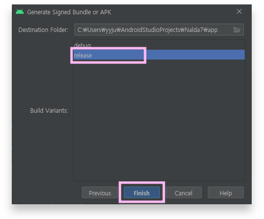 debug용을 선택할 수도 있지만, 우리는 배포용을 목적으로 하기 때문에 release를 선택 후 [Finish] 버튼을 클릭하여 빌드를 시작합니다.