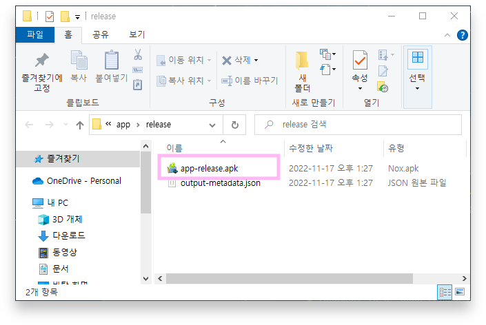 탐색기가 새로 뜨고 APK파일이 만들어진 것을 확인할 수 있습니다.