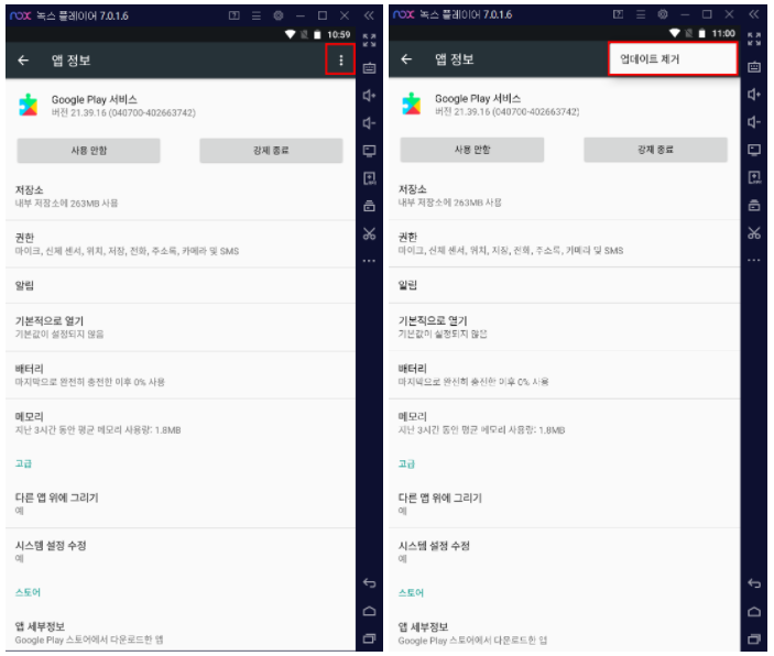 상단 우측의 점3개 아이콘을 누른 후 "업데이트 제거"를 눌러 주세요.
