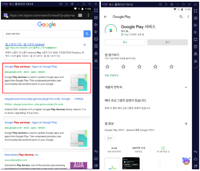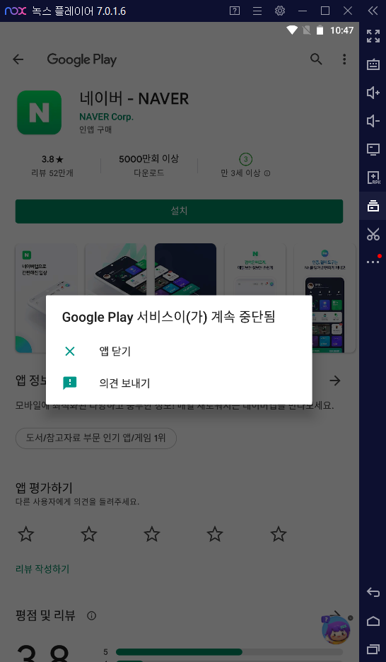 녹스플레이어에서 구글플레이스토어에서 네이버를 찾아 설치하려고 했더니