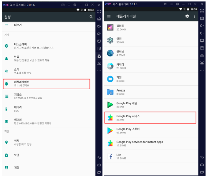 다시 설정 > 애플리케이션 > Google Play 서비스로 들어가 줍니다.