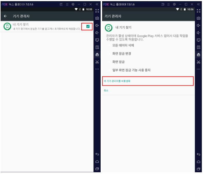 내 기기 찾기 선택 > 이 기기 관리자를 비활성화 를 선택합니다.