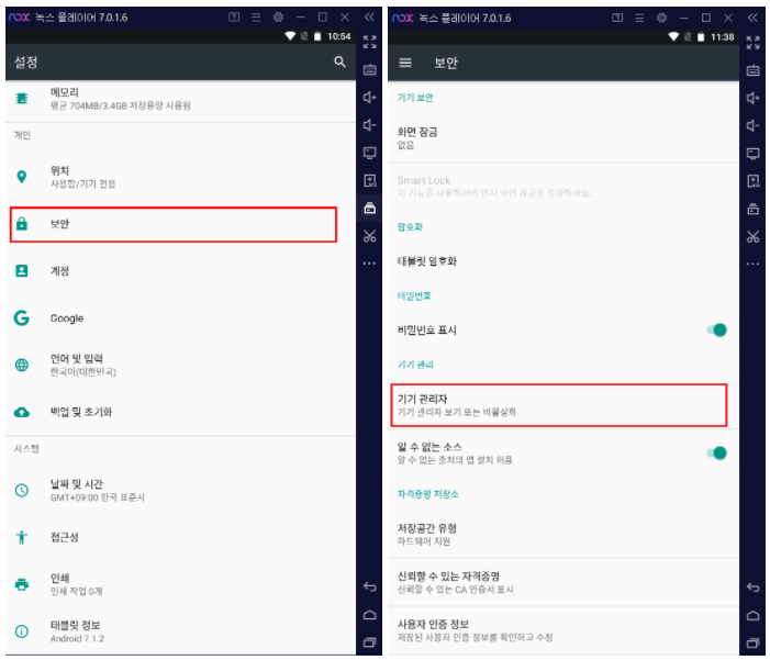설정 > 보안 > 기기 관리자 로 진입합니다.