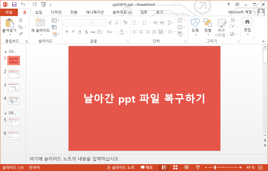 그리고 다시 실행해 주면 아래와 같이 날아간 파워포인트 ppt 파일이 복구되어 정상적으로 열리게 됩니다.