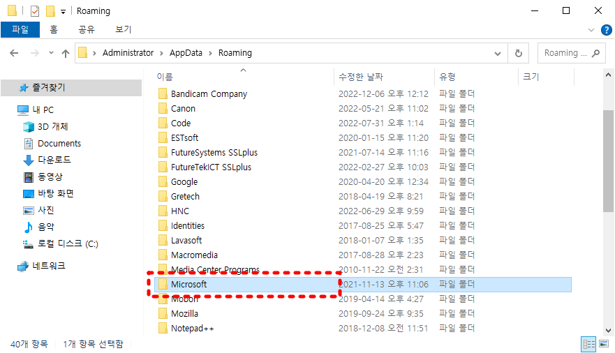 위와 같이 Administrator > AppData > Roaming 폴더가 나오면