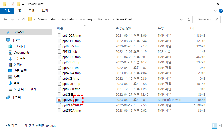 이럴 때에는 아래 그림처럼 tmp파일의 확장자명을 ppt 로 바꾸어 주세요.