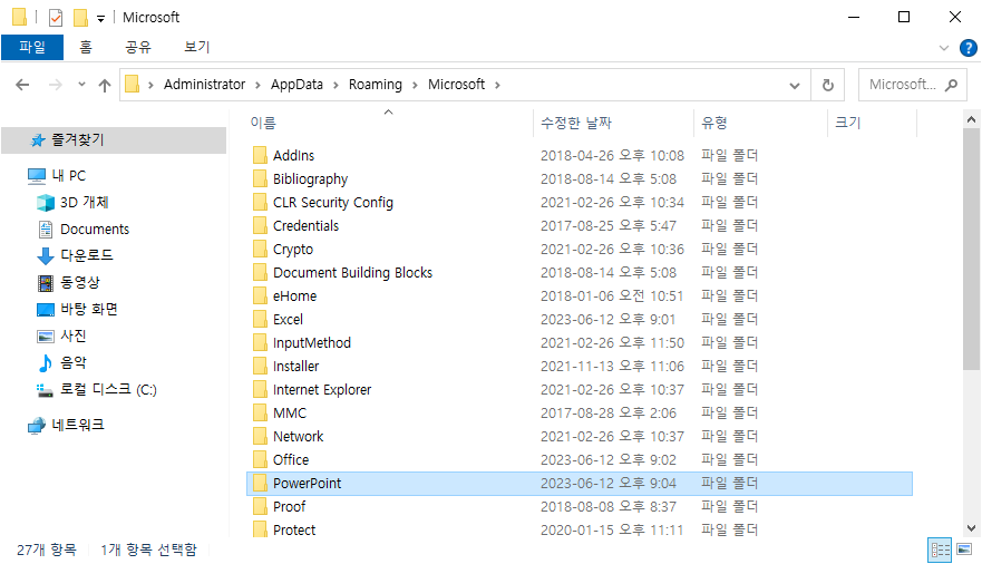 Microsoft 폴더 안에서 PowerPoint 폴더를 찾아 들어가 주세요.
