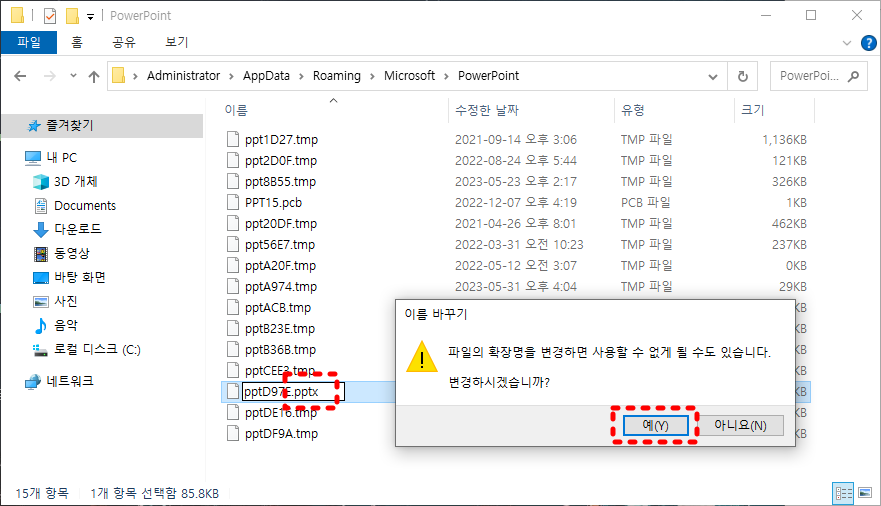 확장자명을 pptx로 변경하면 이름 바꾸기 경고창이 뜨는데 그냥 예 버튼을 클릭합니다.