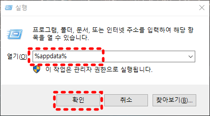 실행창의 열기 입력란에 %appdata% 라고 입력 후 확인 버튼을 클릭해 주세요.